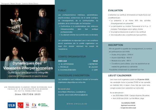 Le Module thématique 4 — Maltraitances envers les personnes âgées s’inscrit dans le cadre du certificat universitaire « Les dynamiques des Violences Interpersonnelles – outils pour une approche intégrée », proposé par le Département de Médecine Générale de l’Université libre de Bruxelles (ULB). Cette formation interdisciplinaire s’adresse aux professionnel·les médicaux, paramédicaux, psycho-sociaux ainsi qu’aux acteurs…